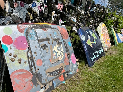 On the afternoon of my visit, there were a handful of cars slowly trolling down the street to view the project. A couple of other folks had parked their car and gotten out to walk around and gawk just as I had. There was a small crew of landscaper carefully mowing and trimming around each of the installations. The project itself is about two city blocks long with installations, and artworks on either side of the street. The street itself is painted with brightly colored circles, which can also be seen on the neighboring houses.