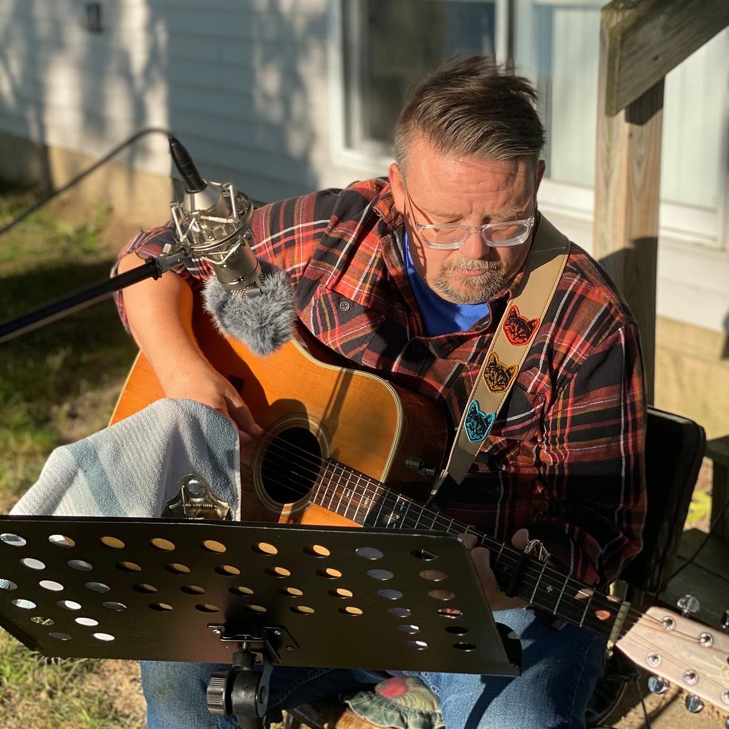 Someone suggested a break and a step out into the late afternoon sunshine of a beautiful early autumn day at the lake. As we chatted, laughed and tilted back a couple of tall ones, I grabbed my acoustic and just began playing around. The guitar was capoed at the fourth fret, where I had written the new song, and I began to just play it as well as I could from memory. Almost immediately, Ian, the bass player in Harborcoat and the Stick Arounds, and lead recording engineer for that weekend said, “Stay right there.”