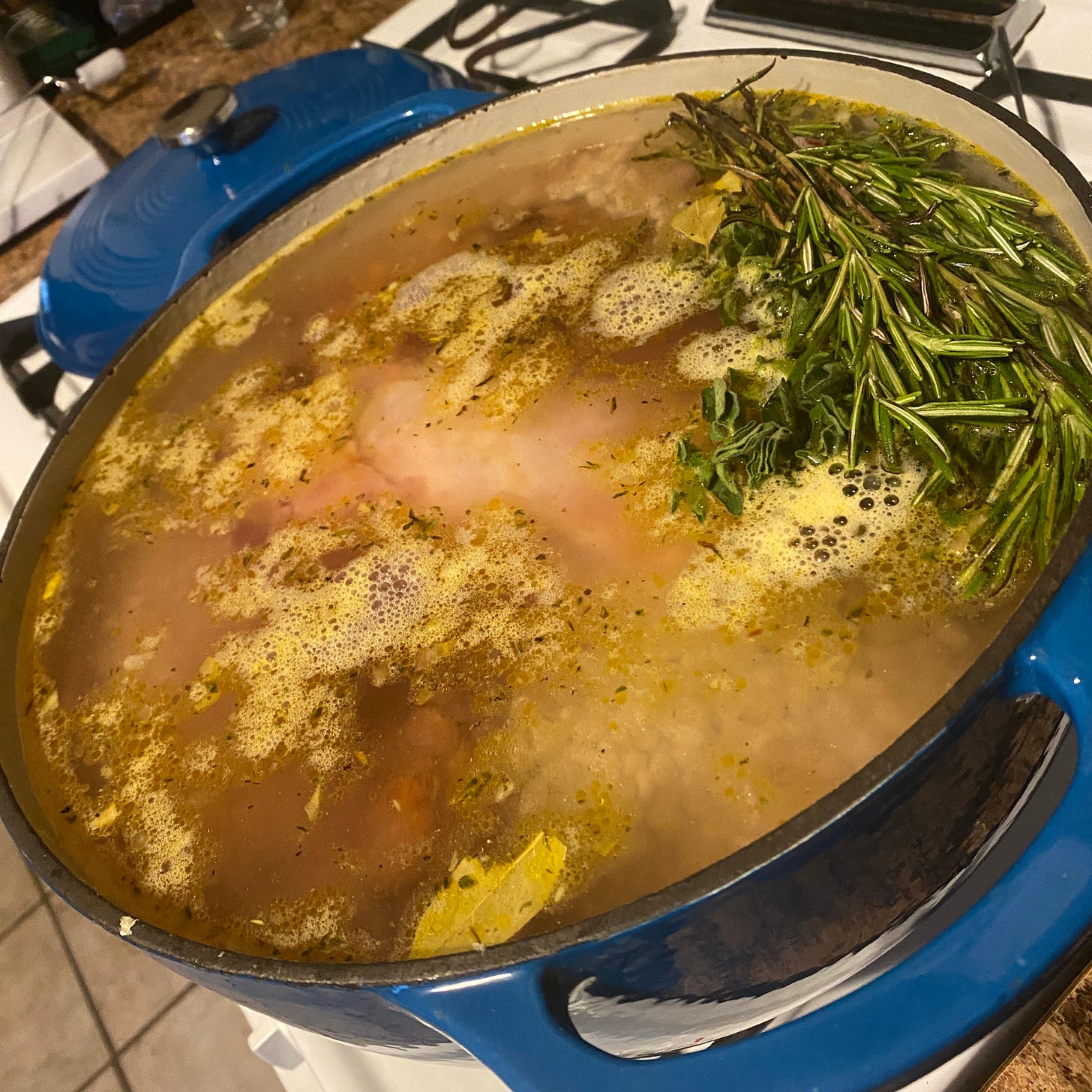 Next, place the fresh herbs in the pot. The ideal way to do this is with a muslin bag that will impart flavor into the soup without any of the physical herbs ending in the finished soup. You can also use some kitchen string and tie the herbs together. I was out of kitchen string and didn't think to grab a muslin bag at the brew shop for this, so I went rustic and just dropped them in as-is. You could also pull the herbs from their stems and chop them up. This is for savages in the wilderness. It’s fine with an extra leaf or two.