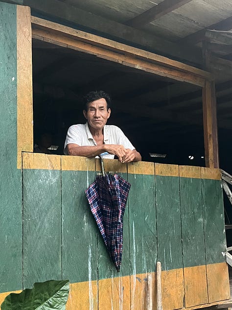 After wandering around in the rain for a while longer and visiting with more of the villages residents, Carlos showed us his own home and even went to grab a ripe coconut from the fired for Monica to have with dinner. Carlos, Monica, Ama, and I took a quick second for a rain soaked selfie in the village square before we headed back to the boat. We all rode in silence back to the lodge as the rain lightened up slightly.