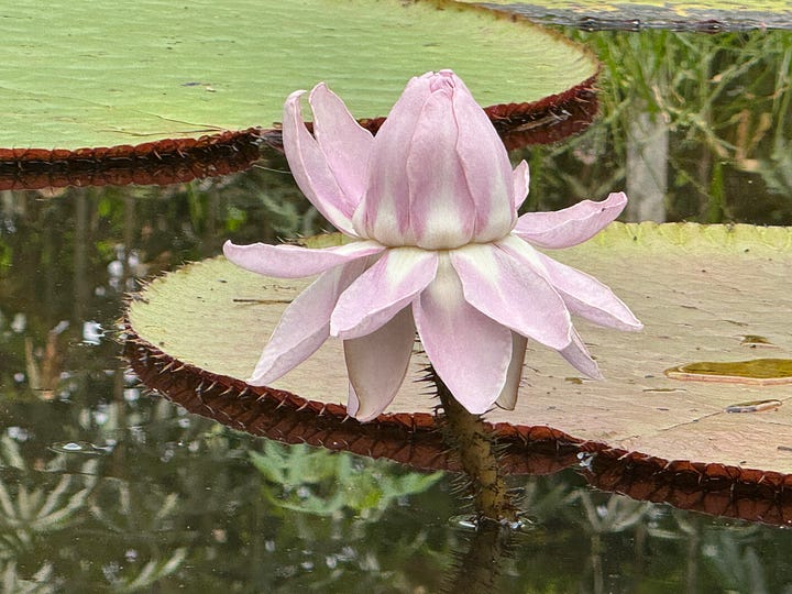 After about fifteen minutes of walking, we reached a clearing and to our left was a large, shallow pond. Atop much of the water’s surface lay a series of massive lily pads measuring from one to three feet across. In several of the pads there was a single flower in the orchid family lying gently atop the massive lily pad that grew to sprout this one magical flower.