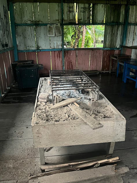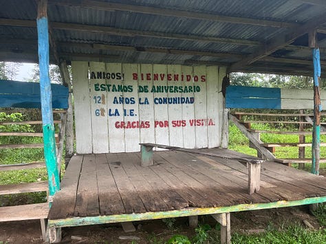 We docked the bat at Timicuro Grande and stepped onto the river’s edge. Carlos led the way up a long path and then over a covered bridge on stilts until we reached the main pathway to the center of the village. As we walked into the main portion of the village, we were greeted with an open field with a soccer goal at either end. A small set of stands, in a bit of disrepair sat along the sideline at midfield.